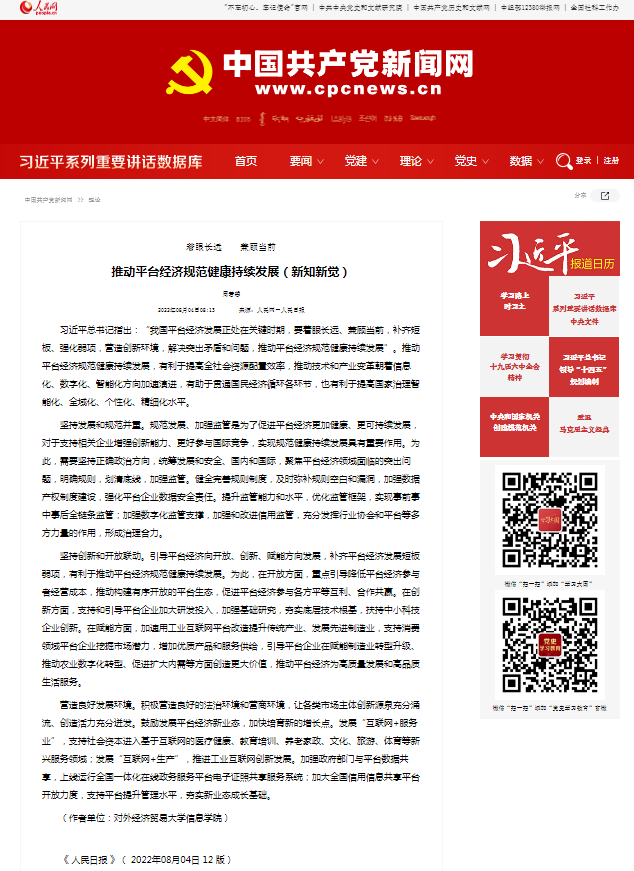 文章简介:习近平总书记指出:“我国平台经济发展正处在关键时期,要着眼长远、兼顾当前,补齐短板、强化弱项,营造创新环境,解决突出矛盾和问题,推动平台经济规范健康持续发展”。推动平台经济规范健康持续发展,有利于提高全社会资源配置效率,推动技术和产业变革朝着信息化、数字化、智能化方向加速演进,有助于贯通国民经济循环各环节,也有利于提高国家治理智能化、全域化、个性化、精细化水平。推动平台经济规范健康持续发展:一是坚持发展和规范并重,规范发展、加强监管是为了促进平台经济更加健康、更可持续发展,对于支持相关企业增强创新能力、更好参与国际竞争,实现规范健康持续发展具有重要作用。二是坚持创新和开放联动,引导平台经济向开放、创新、赋能方向发展,补齐平台经济发展短板弱项,有利于推动平台经济规范健康持续发展。三是营造良好发展环境,积极营造良好的法治环境和营商环境,让各类市场主体创新源泉充分涌流、创造活力充分迸发。
