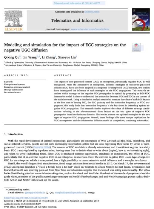 成果信息: Qixing Qu(屈启兴), Lin Wang, Li Zhang, Xiaoyue Liu (2019). Modeling and simulation for the impact of EGC strategies on the negative UGC diffusion. Telematics and Informatics, 45: 101277.1-101277.17.(SSCI检索,Q1)
