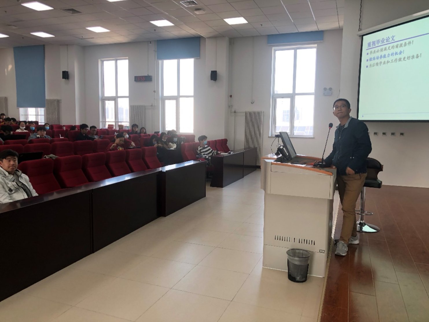 周若馨老师主要从毕业论文(设计)选题类型和注意事项两方面进行讲解。周老师强调选题应注意专业相关性,对毕业论文(设计)引起重视,尽早开始,积极联系老师。同时提醒同学们做好文献管理,并且遵守学术道德。