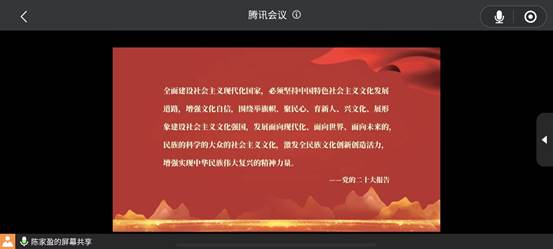 2023年5月11日,为学习贯彻党的二十大中“文化自信”的重要精神,深入推进主题教育支部书记讲党课活动的开展,蜜桃视频 研究生一支部组织了以“推进文化自信自强,铸就社会主义文化新辉煌”为主题的线上党课教育活动。党课主讲人为研究生一支部书记陈家盈。