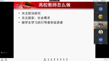 党课最后,袁石老师以“全民终身学习”的理论为基础,针对高校教师群体,提出了如何实现“全民终身学习”。一是要关注研究领域内的前沿理论和技术,二是要将学术研究与国家、社会的需求相结合,三是在教书育人方面要做学生学习的引导者和促进者。