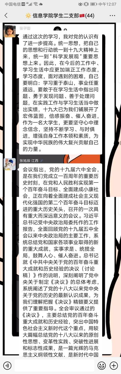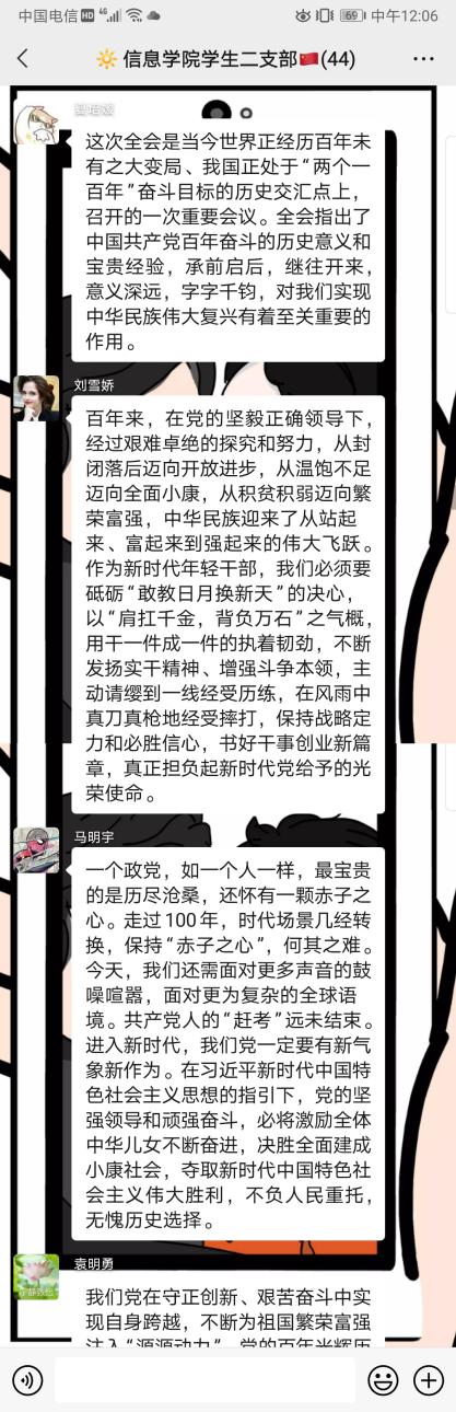 2021年11月18日晚,蜜桃视频 学生二支部通过微信群交流的方式召开了学习2021中国共产党第十九届中央委员会第六次全体会议的交流活动,活动由支部副书记陈家盈同志主持,二支部所有成员共同参与,二支部成员充分交流了各自的感想和心得,感悟到了会议精神,会议取得了圆满的效果。