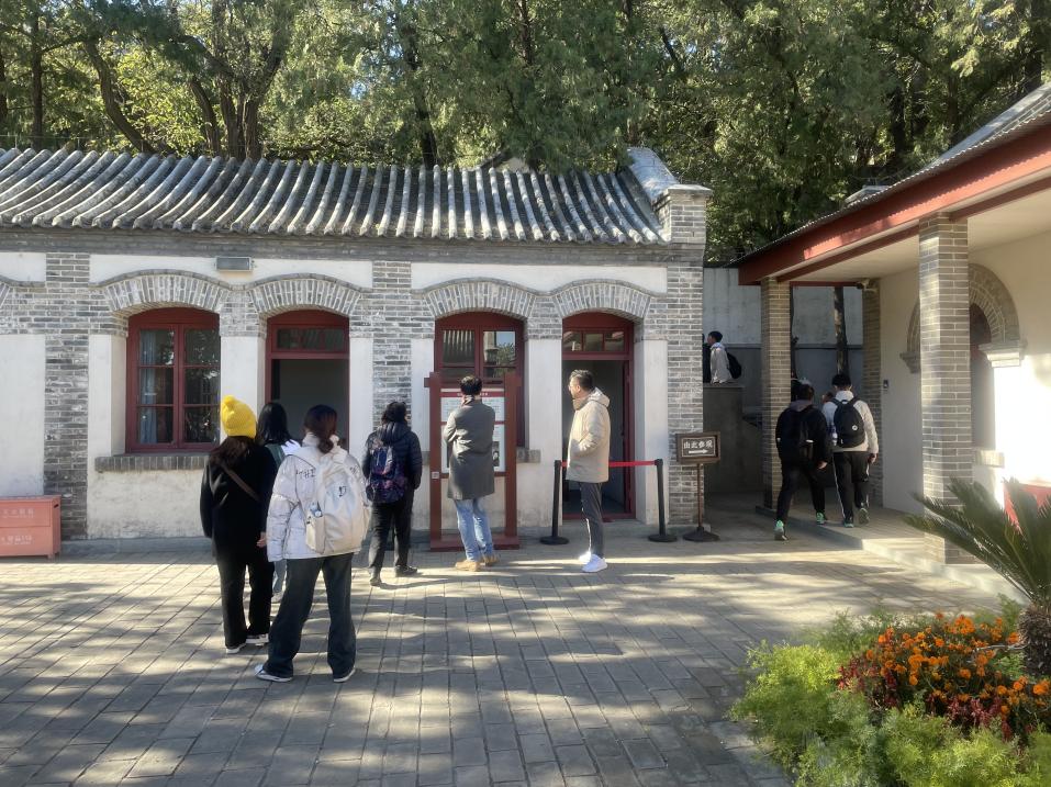 参观完香山纪念馆后,大家步行前往香山公园参观毛泽东、周恩来同志等曾办公居住过的双清别墅以及来青轩等革命旧址。1949年3月中共中央从西柏坡迁至北平,暂住香山。毛泽东居住于此,在这里先后起草了《南京政府向何处去》《丢掉幻想、准备战斗》等文献,并签发《向全国进军的命令》,会见了很多爱国民主人士,筹备了中华人民共和国和中央人民政府的成立。朱德、刘少奇、周恩来、任弼时四位书记住在双清别墅北面仅三四十米远的来青轩,来青轩西侧是周恩来和邓颖超的办公居住地,在原址上恢复了办公室、会客室、卧室等8间房屋。大家在讲解员的带领下参观了来青轩革命旧址,在七十多年后重回那个艰苦卓绝的年代,同学们深刻体会到了中国共产党人团结各界人士凝心聚力描绘新中国宏伟蓝图的艰辛和荣耀。