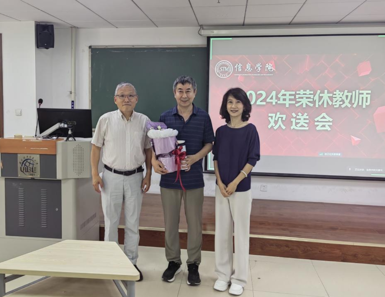 在2024年荣休教师欢送会上,首先由工会主席屈启兴为王朝培、李降龙两位退休教师致辞,并向两位老师表达真诚的感谢和祝愿。随后,院长熊璋向李降龙老师赠送鲜花和定制保温杯作为纪念,感谢李老师多年来的辛勤付出,希望李老师保持对教育热爱的温度。信管系系主任于晓丹组织信息管理系老师为两位退休教师制作了视频,一起回顾了李降龙老师与王朝培老师的教学生涯并送上美好祝愿,希望两位老师享受退休后的美好生活。王朝培老师通过远程视频参会,向大家讲述了自己的感想,感谢蜜桃视频 对老教师的关怀,祝愿蜜桃视频 发展得越来越好。