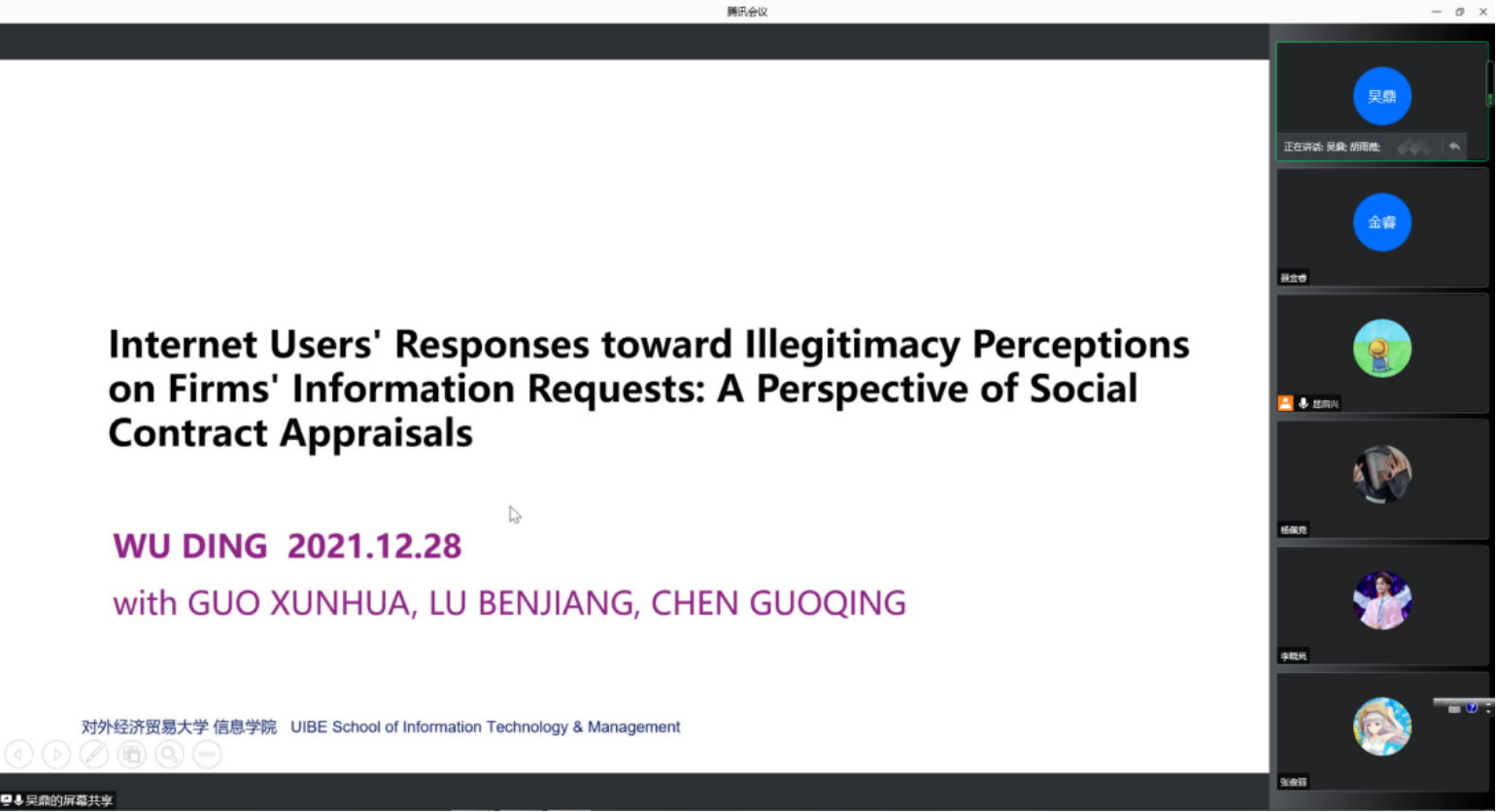 2021年12月28日,蜜桃视频 举办了题为Internet Users' Responses toward Illegitimacy Perceptions on Firms' Information Requests: A Perspective of Social Contract Appraisals的学术讲座。本次讲座邀请对外经济贸易大学蜜桃视频 吴鼎老师作为主讲人,蜜桃视频 全体研究生参加了本次讲座。