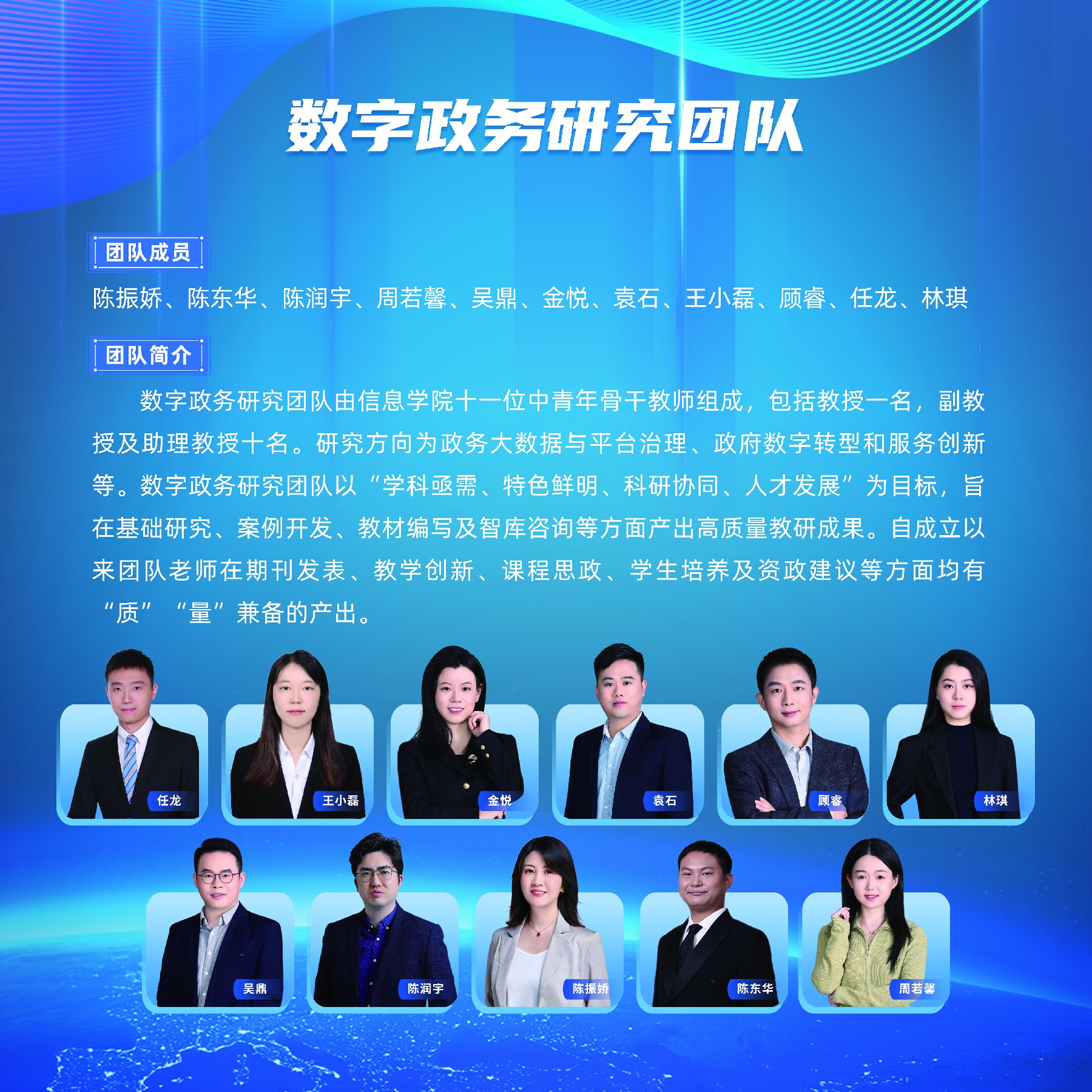 数字政务研究团队由蜜桃视频 十一位中青年骨干教师组成,包括教授一名,副教授及助理教授十名。研究方向为政务大数据与平台治理、政府数字转型和服务创新等。数字政务研究团队以“学科亟需、特色鲜明、科研协同、人才发展”为目标,旨在基础研究、案例开发、教材编写及智库咨询等方面产出高质量教研成果。自成立以来团队老师在期刊发表、教学创新、课程思政、学生培养及资政建议等方面均有“质”“量”兼备的产出。