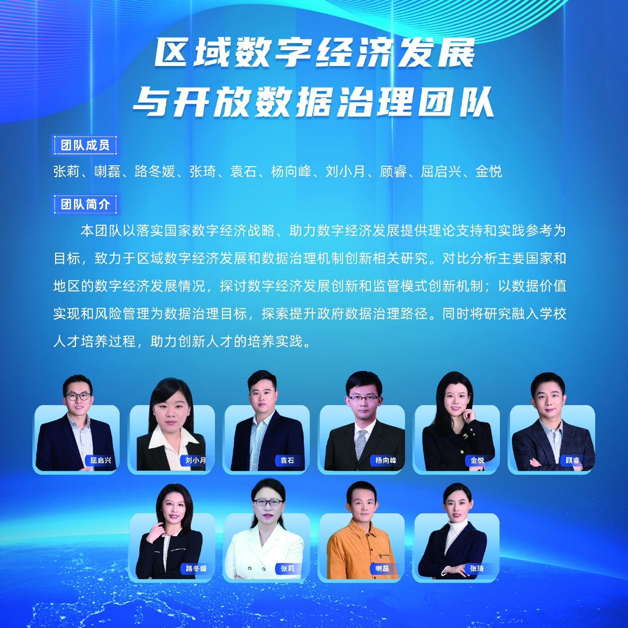 本团队以落实国家数字经济战略、助力数字经济发展提供理论支持和实践参考为目标,致力于区域数字经济发展和数据治理机制创新相关研究。对比分析主要国家和地区的数字经济发展情况,探讨数字经济发展创新和监管模式创新机制;以数据价值实现和风险管理为数据治理目标,探索提升政府数据治理路径。同时将研究融入学校人才培养过程,助力创新人才的培养实践。