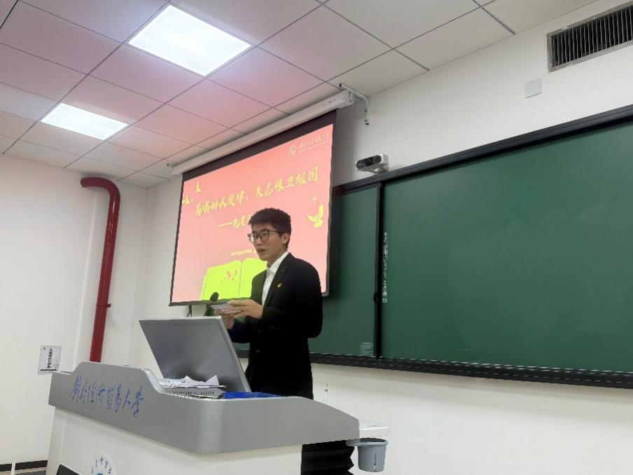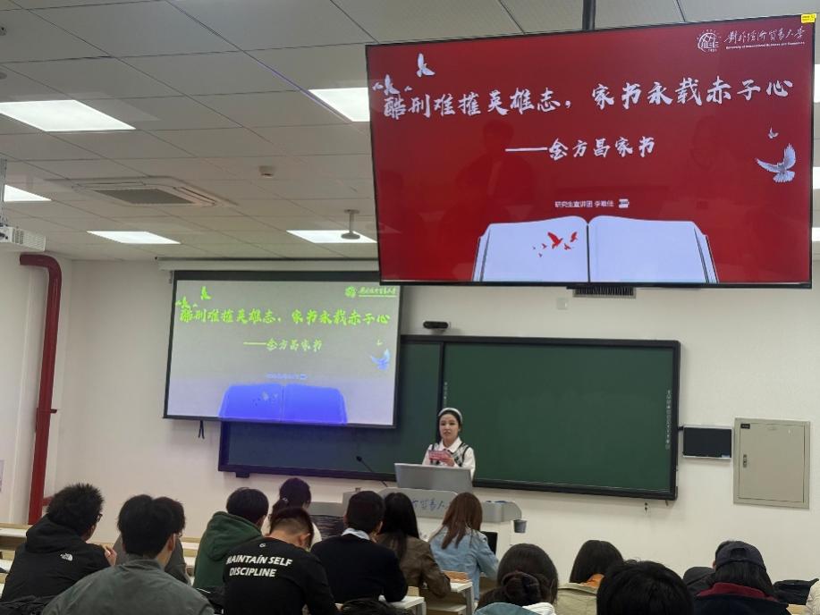 宣讲围绕抗战英雄的家书与事迹展开,激励青年学子从中汲取精神力量,厚植爱党爱国情怀。宣讲过程中,国际经济贸易蜜桃视频 杨砚成同学以《高唱动人旋律,矢志保卫祖国——冼星海家书》为题,展现了人民音乐家以音符为枪、用旋律鼓舞斗志的赤子之心;国际经济贸易蜜桃视频 汪韫珂同学带来的《铭记先烈志,勇担家国情——李育才家书》,深情讲述了革命先辈为国为民、舍生忘死的家国担当;保险蜜桃视频 李唯佳同学则通过《酷刑难摧英雄志,家书永载赤子心——金方昌家书》,生动再现了革命烈士坚贞不屈、视死如归的英雄气概。宣讲人声情并茂的诵读与深入浅出的讲解,使在场同学深受触动。