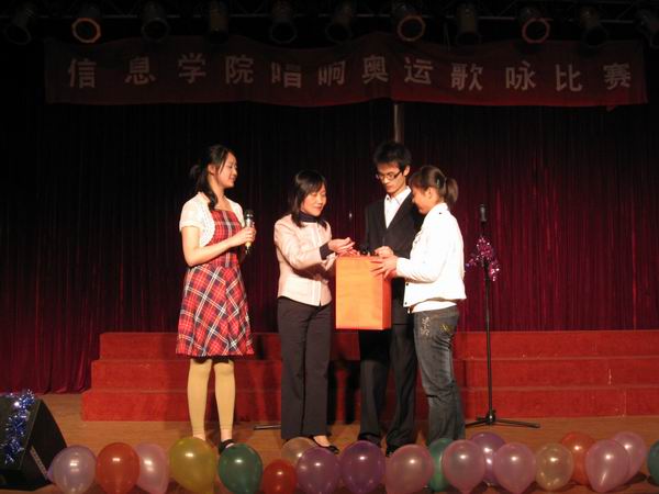 中场休息期间,上届K歌大赛的人气之星毛昱陆给大家带来了《远走高飞》,同学们反响热烈。紧接着C组上场的是06电三、07信二、06电二。首先上场的06信管三班,正如他们所说,一年多的相处,彼此间的默契引领着他们一步步走向前。《我是明星》以及清唱的《友谊地久天长》就是他们口号中不抛弃不放弃的体现,悠扬的乐曲回荡在大活久久不能停息。第二个07信管二班为我们带来的《万水千山总是情》和《年轻的战场》声音搭配的完美无瑕,真的是一个心有灵犀,信有灵犀的一个集体。全场最后一个出场的是06电商二班,以他们独有的自信,用音符告诉我们20颗年轻的心,20种不同的性格怎样友好、和谐、亲密无间的成为永恒的旋律——再次唱响了《爱因为在心中》。之后张志娟副书记还为大家抽取了幸运观众奖。
