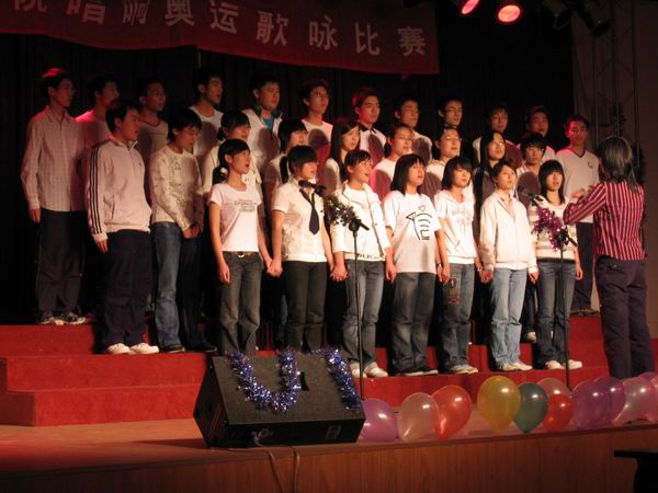 轻松的小游戏过后,全场紧张的气氛得到缓解。然后进行了B组的比赛。它们分别是07信一、06电一、06信二。第一个上场的07信管一班以一曲悠扬的《爱因为在心中》开始了他们的合唱表演,精彩入情的歌唱让我们时刻感受到了温暖和积极进取,第二曲《桃花多多开》则引起了全场又一次的高潮,其变化的形式、穿插的表演,收到了良好的效果,都让我们无法忘记这个温馨团结的大家庭。06电商一班用他们的歌声诠释着年轻就是一切,告诉世界有一种力量来自电商一班。B组最后一个出场的是06信管二班,坚守信念执著追求的他们唱出了《hand in hand》表达对奥运的坚定支持。苗冬青老师在设备故障期间主动“救场”,以一首《我愿意》赢得了大家热烈的掌声与尖叫声。
