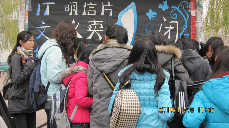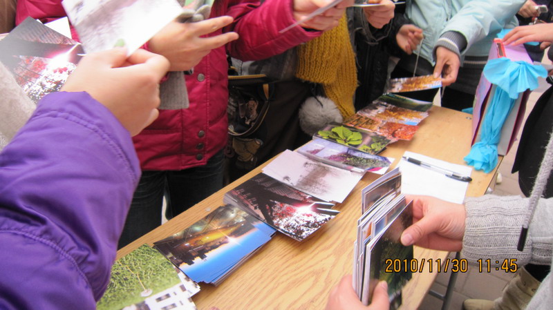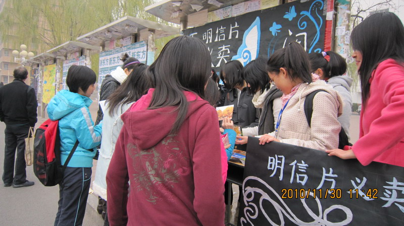 的同学们热情高涨,不时的齐声呐喊,在大家的共同努力下,不到一个小时2000张明信片便被抢购一空。