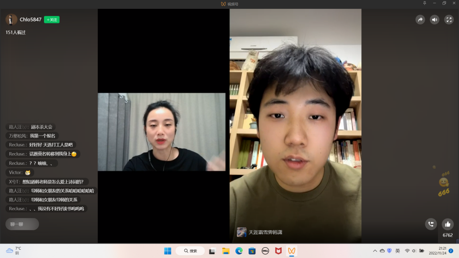 在第六期直播里,《鳗鳗龙门阵》邀请到的嘉宾是来自中文蜜桃视频 的韩潇老师,活动主题为“我和老师——青年教师的课余生活”。韩潇老师谈吐幽默、妙语连珠,与鳗鳗老师的精彩对话让同学们在放松身心之余受益匪浅,更让同学们对青年老师们丰富多彩的课余生活有所了解,拉近了师生之间的距离。韩潇老师不仅是课堂上风度翩翩的贸大男神,还是生活中多才多艺的北大才子。他热爱文学,曾创作多部剧本;他喜欢演戏,多次尝试话剧中的各种角色;他还爱好唐诗宋词,多次创作相关历史剧。同时,他也是一位资深爱猫人士,世界杯法国队球迷,剧本杀爱好者。最后,他希望同学们都能够拥有乐观的心态,学会与自己和解。同学们在直播间与老师们积极互动,氛围欢乐融洽。