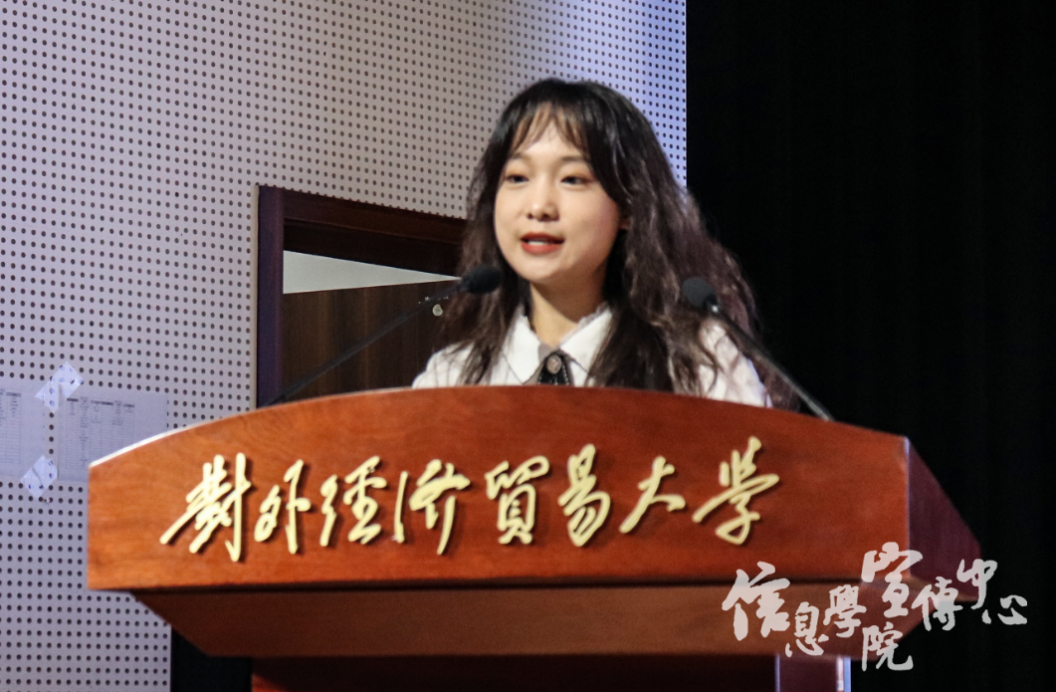 研究生新生代表严铖钦同学回顾了自己的本科经历,在大学生活中觅得良师益友,不断自我超越,在学生工作与志愿支教中磨练了自己的意志,并从支教经历中明白了言传身教、育人为本的意义。展望未来,她希望能与同学们一同面对挑战,脚踏实地,为科研做贡献,担当时代使命。