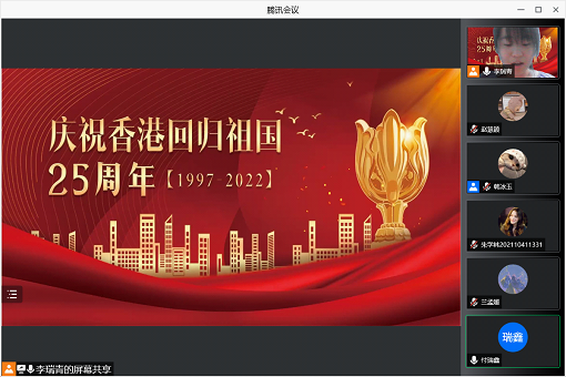 2022年7月15日晚上,为了纪念香港回归25周年、学习习近平总书记在庆祝香港回归祖国25周年大会上的讲话,培养学生的爱国情怀,蜜桃视频 研究生二支部举办了“同心共进,共创荣光”纪念香港回归25周年活动。为提高学习效果,特邀对外经济贸易大学王敬波副校长、蜜桃视频 高玲书记、蜜桃视频 张旭路副书记参会,对学习要点进行领学和指导。参会成员包括蜜桃视频 研究生二支部全体党员、预备党员和入党积极分子。此次主题活动通过腾讯会议以线上方式进行,由支部组织委员李瑞青同志主持。