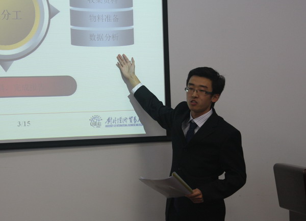 “大宗商品的交易市场调研竞赛”分为两个环节,12个小组依次上台进行10分钟的PPT演示和自由答辩。各组选手汇报了前期大宗商品交易市场调查报告的结果,指出了各个市场的优势和不足之处,对各个市场前景进行了预测,并指出了各种改进意见。选手们用生动形象的PPT,新颖的观点,清晰的思路,自信流畅的语言,向评委们细致地展示了他们的调研成果。在答辩环节,各位评委分别就各组展示的内容进行提问,如详细询问调研方法、对一些细致的调研环节进行了确认。同时,评委老师们对选手的表现作简要点评并提出完善意见。