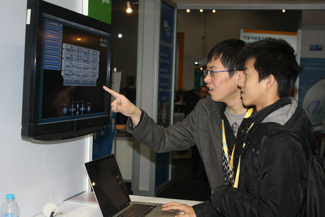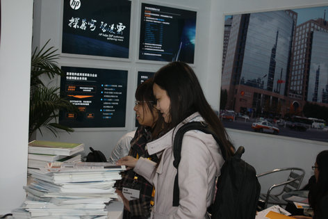 主题演讲结束后,同学们在展示区自由参观。商务分析与技术创新区、行业与业务方案区、生态圈与合作伙伴区、成长型企业区等四大展区云集了几十家企业,通过主题演讲、圆桌讨论、产品展示等形式,为参观者提供了丰富的科技前沿信息。同学们饶有兴致的参观,并领取了自己感兴趣的企业或产品的小册子仔细学习研究。