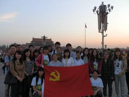 学生一支部于5月27日的清晨组织11级和09级的部分党员代表来到了天安门广场,观看升国旗仪式。一同前往的还有分党委副书记张志娟老师、学生一支部书记秦东方老师,以及退休二支部的部分老干部。