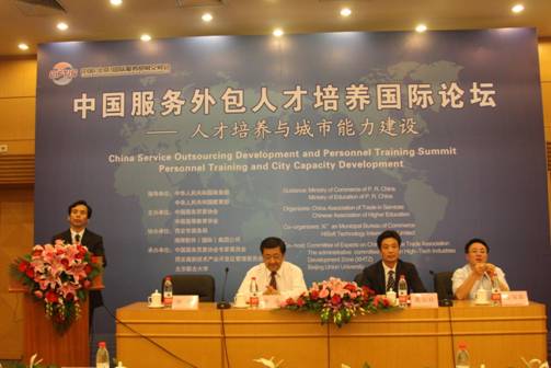 中国(北京)国际服务贸易交易会中国服务外包人才培养国际论坛于5月29日在北京京民大厦大礼堂举行。本次大会由商务部和北京市政府联合主办。论坛共分为三部分:开幕式、主旨演讲、人才培养与城市能力建设。