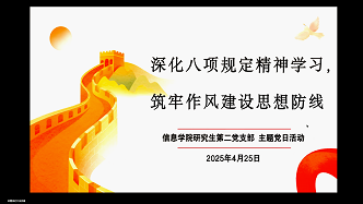 (蜜桃视频 研究生二支部党员王竟宇讯)为深入学习中央八项规定精神,强化支部党员的纪律意识,贯彻全面从严治党的重要原则,2025年4月25日蜜桃视频 研究生二支部于线上举行“深化八项规定精神学习,筑牢作风建设思想防线”党日活动。此次活动旨在强化支部学生党员的政治自觉、思想自觉、行动自觉,引导全体同志深刻认识全面从严治党永远在路上的战略定力,树牢纪律规矩意识,校准价值坐标,在科研学习、社会实践、日常言行及未来工作中自觉遵守党的纪律要求,切实将中央八项规定精神内化于心、外化于行。
