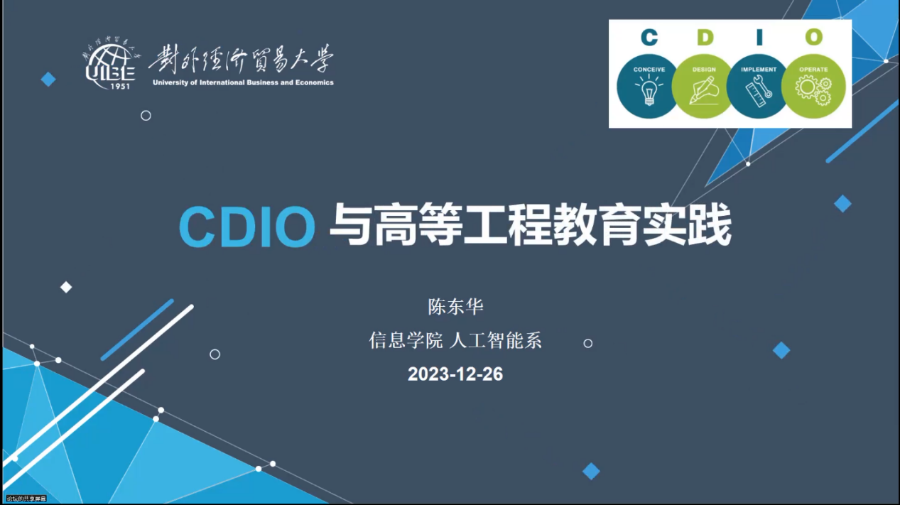 陈东华老师以“CDIO与高等工程教育实践”为题做了报告,陈老师通过实际案例分析与文献综述的方式,介绍了工程教育改革的背景、CDIO方法理念、CDIO的基本内容、CDIO的教学大纲、以及如何推动CDIO教育理念与方法同人工智能的融合。