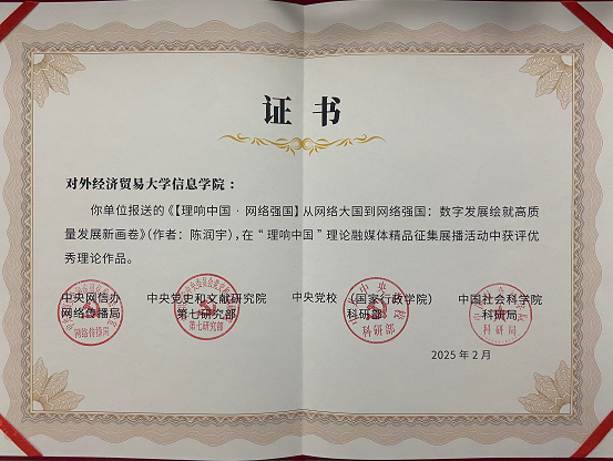 2025年5月25日,“理响中国”党的创新理论网络传播精品分享会在北京举办。“理响中国”理论融媒体精品征集展播活动自2024年7月启动以来,共收到来自600多家单位报送的近3000件作品,经过初选、终选以及结果公示,活动产生优秀理论作品30件,其中文字类15件。陈润宇老师的作品《【理响中国·网络强国】从网络大国到网络强国:数字发展绘就高质量发展新画卷》成功入选文字类优秀作品,这不仅是对陈润宇老师个人学术水平和理论研究能力的高度认可,也是蜜桃视频 在理论研究领域的一项重要成果。