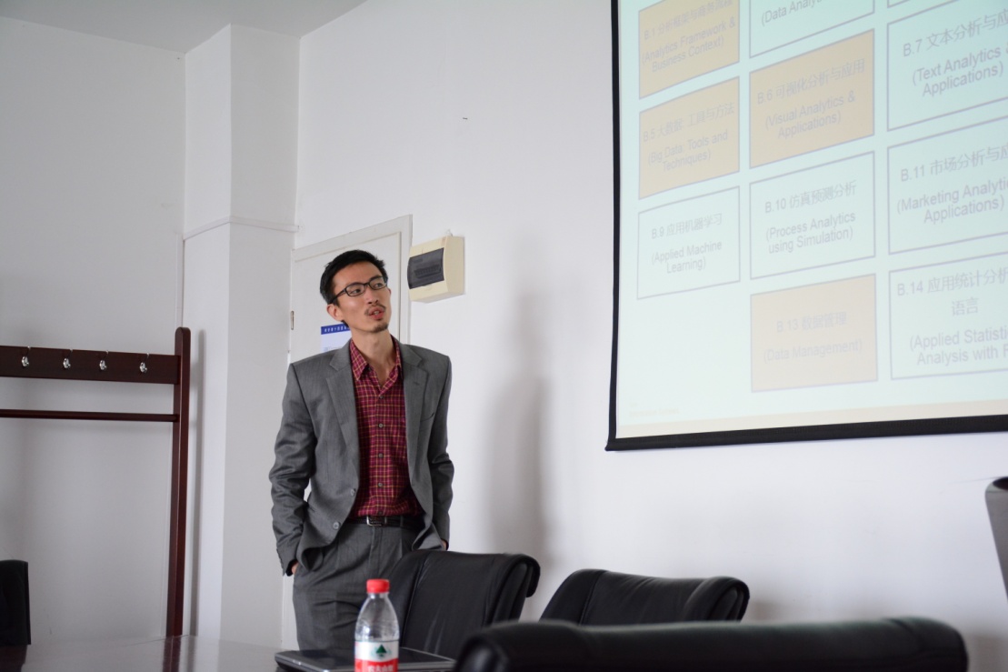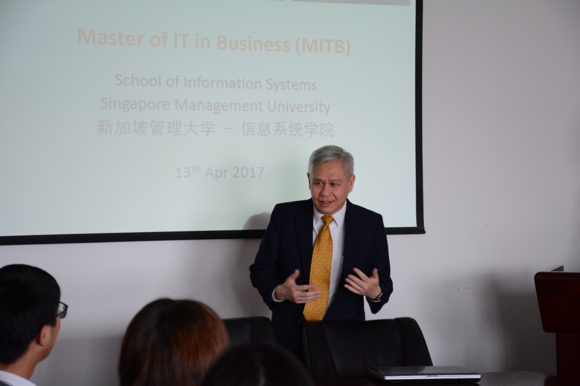 接着ANDREW KOH博士对商业信息技术中数据分析方向相关课程进行了介绍。Andrew博士首先对大数据在测试年龄,百度地图迁徙人气等方面的具体应用进行了举例,拉近了与同学的距离,引发学生对课程的亲切感;然后简单介绍了大数据在金融、电信、咨询服务、医疗保健、零售、以及运输与物流等方面的广泛应用以及对商业信息技术硕士项目的学习年限,成绩要求,费用及奖助情况进行了详细说明。