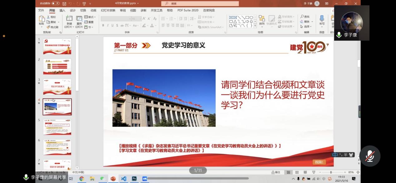 为认真贯彻落实习近平总书记在党史学习教育动员大会上的重要讲话精神,教育引导支部党员把握历史发展规律,树立正确党史观,增强斗争意识,提高斗争本领,强化责任担当,奋勇推进中华民族伟大复兴历史伟业。5月16日蜜桃视频 研究生二支部以支部书记讲党课的形式于腾讯会议召开“党史教育进校园 红色精神永流传”主题线上会议。此次党课由研究生二支部书记李子康同志主讲,支部全体党员参加。
