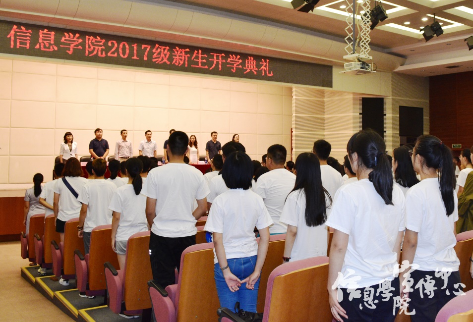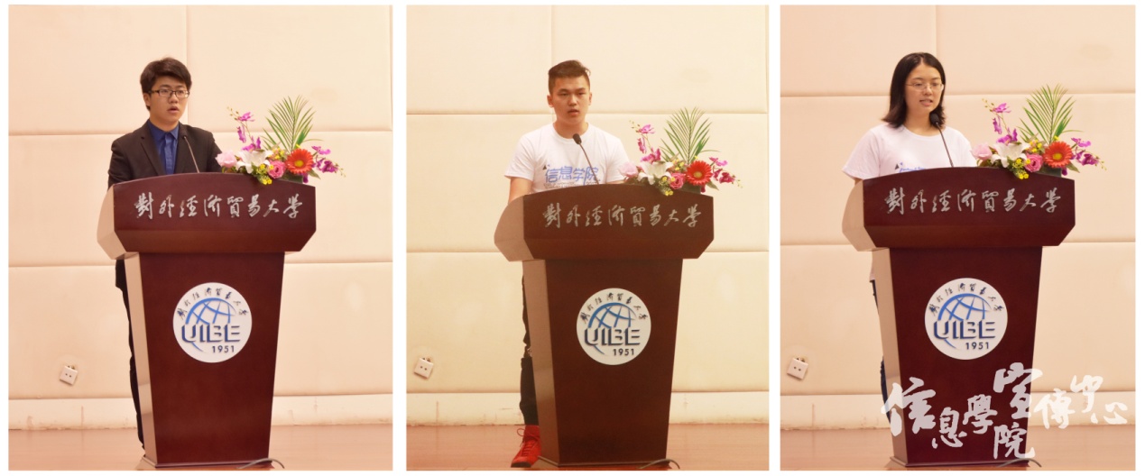 紧接着,在校生代表院学生会主席、2015级郭振同学向大家讲述了在信院学习成长的经历,对新生的学习生活提出了自己的建议,并代表全体在校生对新同学们送上了最衷心的祝福。随后2017级本科新生代表谭媛元和研究生新生代表王子菡依次上台发言,表达了莘莘学子加入信院的喜悦以及不忘初心、追求卓越的坚定信念。