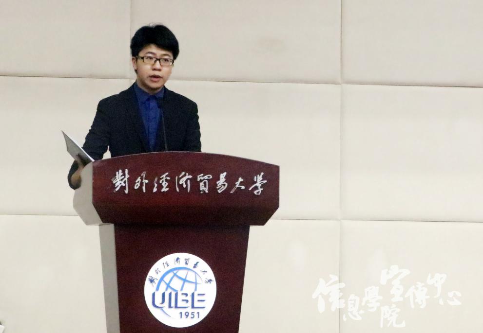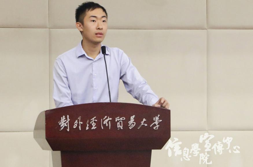 团学联主席郭振上台致辞。他详细阐述了团学联各部门的工作职能、必备技能、团学联的组织架构、承办的活动以及取得的荣誉。他希望新生们都能在未来的团学工作中展现自我,锻炼自我,放飞自我。