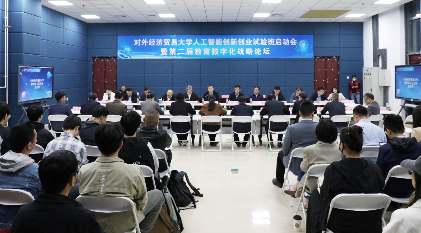 2024年4月12日,对外经济贸易大学人工智能创新创业试验班启动会暨第二届教育数字化战略论坛在我院人工智能实验室成功举行。北京市教育委员会副主任张耀天、教育部课程教材研究所党委副书记、纪委书记韩春勇、教育部课程教材研究所数据资源服务中心副主任刘林、教育部高教司理工处主任袁楠、蜜桃视频 校长赵忠秀、党委副书记、纪委书记李茂国、研究生院院长黄薇、教务处处长毛捷、招生就业处处长连英青、发展规划处副处长孙娜、国际商蜜桃视频 党委书记王铁栋、中国金融蜜桃视频 党委书记曹小勇、保险蜜桃视频 副院长孙守纪及我院师生参加会议,院党委书记梁伟主持会议。会议还邀请了飞腾、麒麟、金山、华胜天成、达闼机器人和FESCO等合作企业负责人参会。与会嘉宾研讨“人工智能+”背景下拔尖创新人才培养新模式,并为对外经济贸易大学“人工智能创新创业试验班”揭牌。