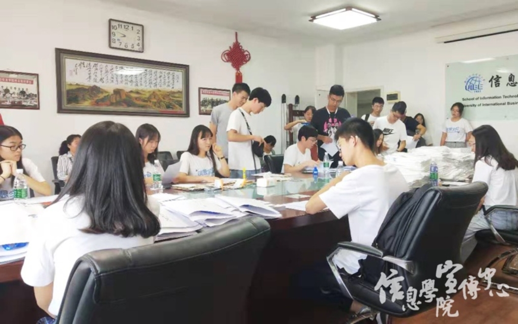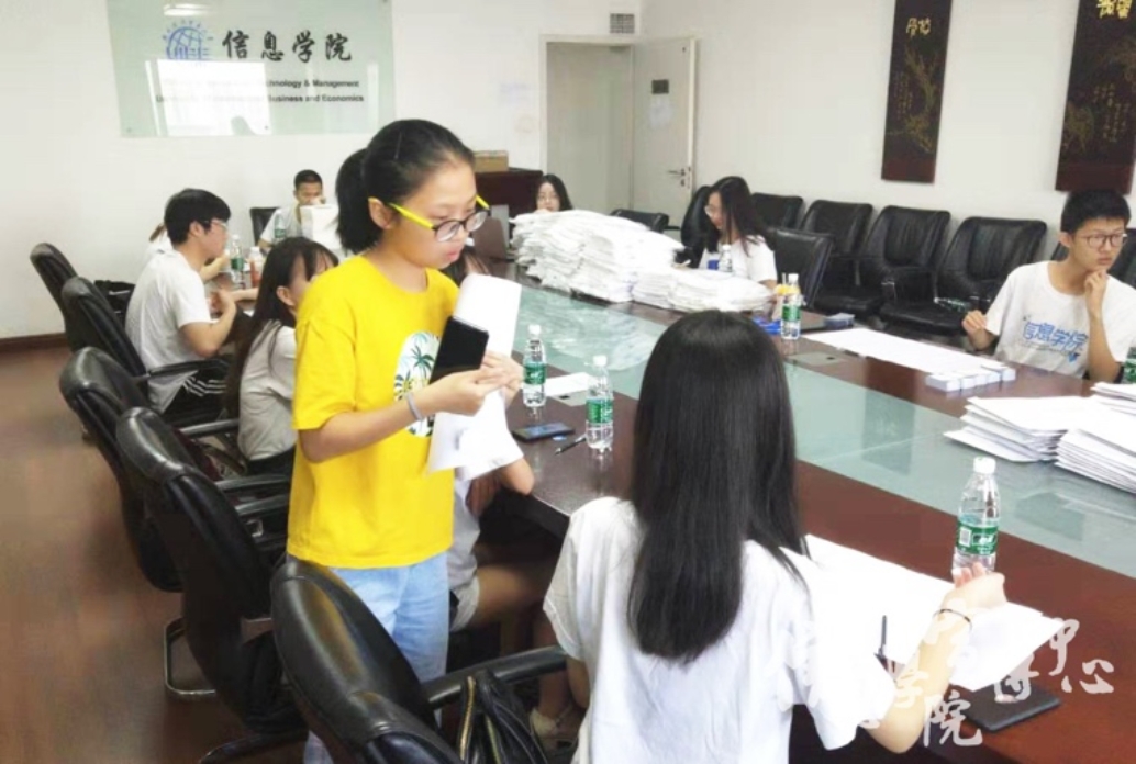 与此同时,在另一个会场——博学1416,迎新工作也在有条不紊地进行。分工明确的材料收发,耐心细致的讲解,新生们满脸的疲惫已经被学长学姐们热情的服务所驱散,显得格外兴奋。陌生的环境、陌生的面孔却也掩藏不住他们初来的欣喜。