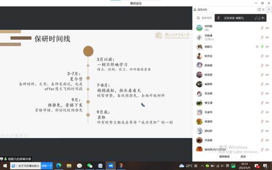 (蜜桃视频 21级入党积极分子宋柯颖讯)2023年5月9日晚上8:30,为了推动学习贯彻习近平新时代中国特色社会主义思想主题教育深入开展,把学习和实践有机地融合起来,发挥党员力量,办好群众满意的“实事好事”,蜜桃视频 2019级党员同志为2021级开展“一对多”经验分享活动。本次活动邀请到了两位来自2019级的党员同志——杨懿凡(已保研至中国人民大学)、杨璐(帝国理工大学深造)为2021级的支部成员做学业规划的经验分享,有针对性地解决同学们在未来规划中可能会遇到的问题和疑惑,充分起到“朋辈引领”的作用。本次分享会由邓皓谦同学主持,以线上会议的方式进行。