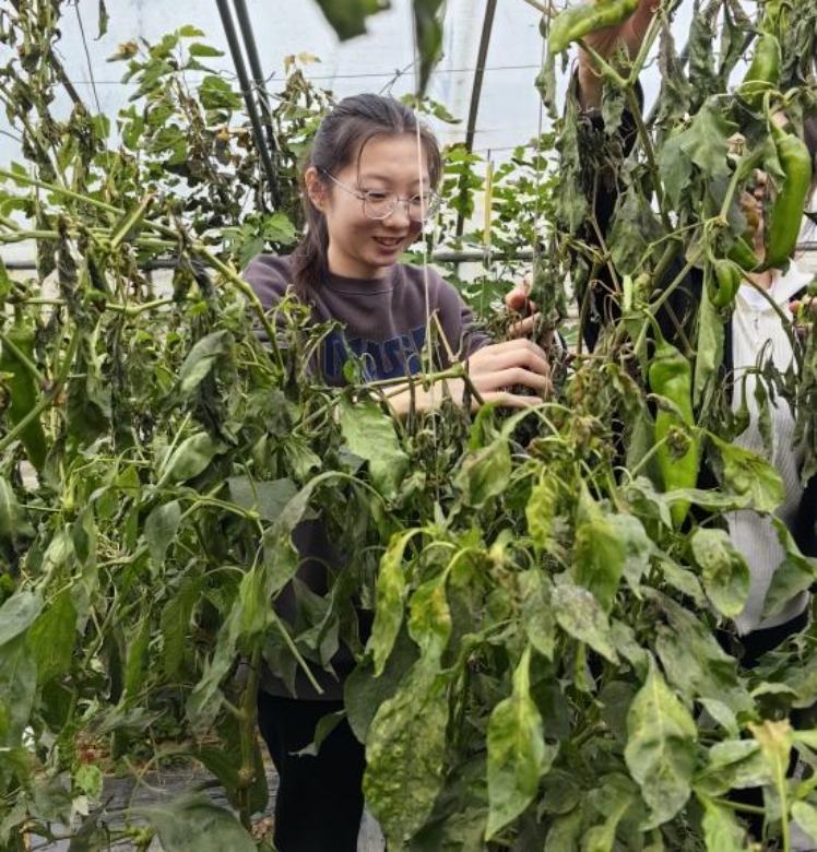 活动首站,同学们在工作人员的指导下开启辣椒采摘实践。工作人员从辣椒品种特性到采摘手法逐一讲解。随后,同学们以小组为单位分工协作,采摘成熟果实、整理装筐、清运残枝。经过高效劳作,几大筐红绿相间的辣椒整齐码放,展示着丰硕的成果。