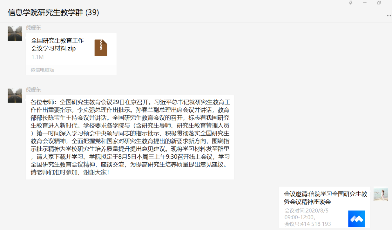 8月5日上午9:30我院召开线上会议,组织学习全国研究生教育会议精神,并组织了座谈交流,为提高研究生培养质量提出意见建议。本次会议共有27名研究生导师与1名研究生教学管理人员与会,会议由分管研究生培养工作的副院长倪耀东主持,倪院长传达了全国研究生教育会议精神,并结合蜜桃视频 研究生教育工作现状对学习文件进行了详细解读。随后各位老师展开热烈讨论,畅谈学习体会,从研究生培养过程管理、课程设置、招生专业配置、培养质量提升等方面提出宝贵意见建议。座谈会后,更有多位老师撰写了会议精神学习心得体会。蜜桃视频 研究生培养办公室对老师们的心得体会和意见建议汇总整理,对学习情况进行了梳理总结。