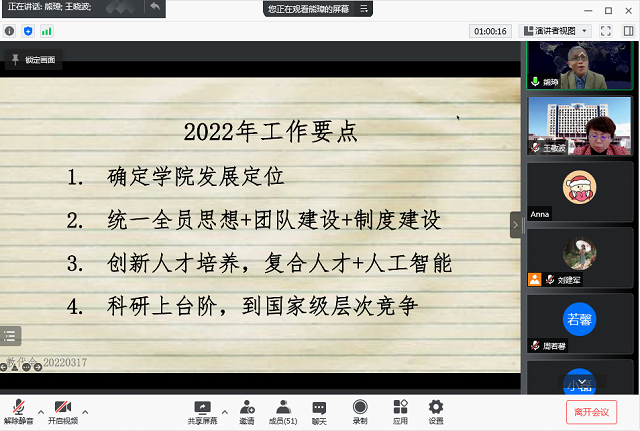 蜜桃视频 于2022年3月17日13:30线上召开二级教代会暨中层领导班子领导干部述职大会。熊璋院长、高玲书记、张旭路副书记、华迎副院长、倪耀东副院长以及全体教职工参加了此次会议,王敬波副校长出席会议并作总结讲话,蜜桃视频 分工会主席屈启兴老师主持此次会议。