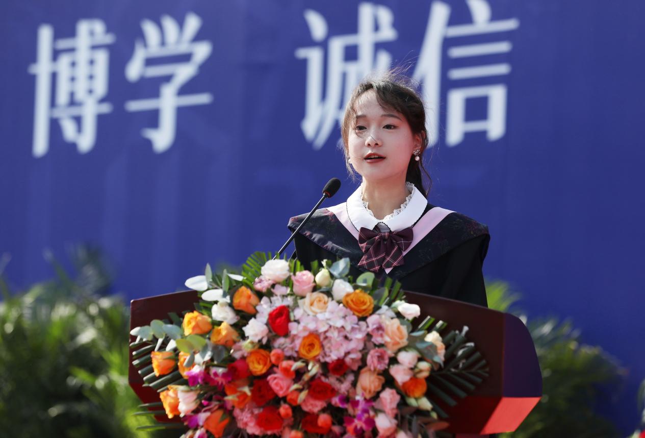 还记得校领导曾寄语我们:“今天的你们就是中国的今天,明天的你们就是明天的中国”。亲爱的同学们,我们自五湖四海相聚,即将向天南地北远行,在各自的人生中书写新的篇章。我们会永远怀念这里,怀念满是银杏落叶的金秋惠园,怀念曾等过流星的情人坡,怀念讲台上下为我们蜡炬成灰的老师们,还有一直守护我们平安喜乐的宿管阿姨、食堂师傅、保卫大哥……下个月,我即将赴云南勐腊第一中学支教,我一定会和在座的每一位毕业生一样,带着贸大人的坚守、执着与奋进,去亲身证明,贸大一定能行,贸大人走到哪都能行!