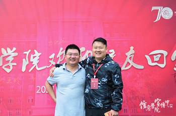 校友们在求索楼签名墙前签名并合影留念,一同庆祝母校七十周年华诞。