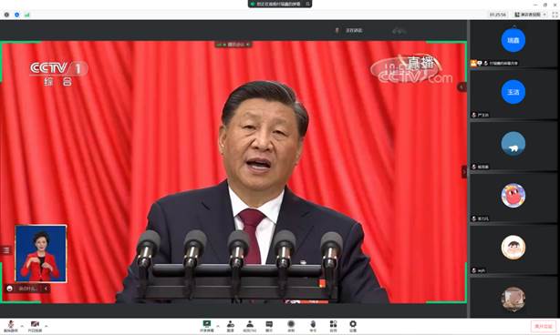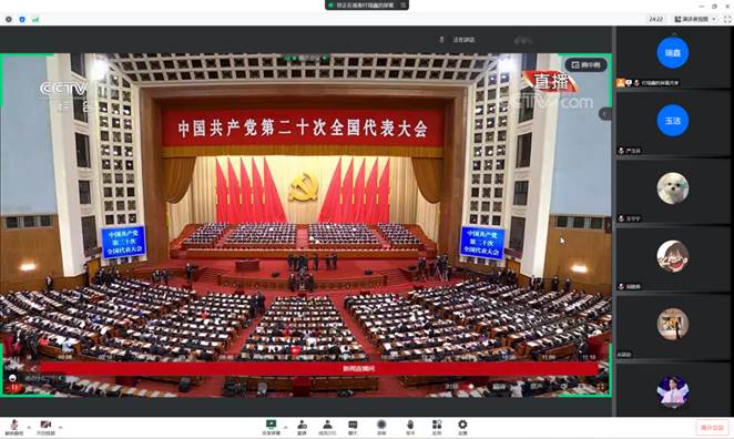 2022年10月16日,中国共产党第二十次全国代表大会隆重开幕。党的二十大是在全党全国各组人民迈上全面建设社会主义现代化国家新征程、向第二个百年奋斗目标进军的关键时刻召开的一次十分重要的大会,大会的主题是:高举中国特色社会主义伟大旗帜,全面贯彻新时代中国特色社会主义思想,弘扬伟大建党精神,自信自强、守正创新,踔厉奋发、勇毅前行,为全面建设社会主义现代化国家、全面推进中华民族伟大复兴而团结奋斗。上午10时,蜜桃视频 研究生二支部采用线上会议的方式,组织全体成员集中收看中国共产党第二十次全国代表大会开幕会直播,认真聆听、学习了习近平总书记代表十九届中央委员会向大会作的报告。