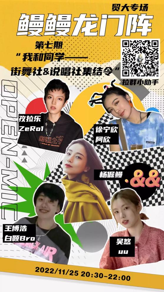 在第七期直播里,《鳗鳗龙门阵》邀请了说唱社和街舞社的王博浩同学、孜拉乐同学、吴悠同学和徐宁欣同学,活动主题为“我和同学——街舞社和说唱社集结令”。几位同学与鳗鳗老师有趣欢乐的对话,活跃了直播间里的气氛,也激发了同学们对说唱、街舞的兴趣。嘉宾们先后谈到自己练习、表演的经历,展现了他们高超的技术以及对说唱街舞的热爱。几位嘉宾的一段段即兴表演,深深吸引了直播间的观众们,引得评论区阵阵喝彩。同时,嘉宾们也向大家分享了自己的练习方法,希望对感兴趣的同学有所帮助。