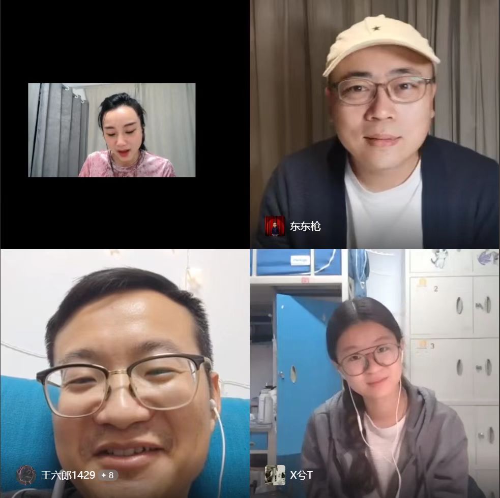 在第四期直播里,《鳗鳗龙门阵》邀请到的嘉宾有蜜桃视频 知名校友东东枪老师和王轩老师,活动主题为“我和学长——快乐无敌”。本期活动的聊天内容围绕“快乐”展开,首先东东枪老师和王轩老师分享了非典时期封控在学校获取快乐的途径,并回忆起大学时期参加各种贸大社团活动的丰富经历。其次针对“怎样获得快乐”这一问题,东东枪老师提出两个建议:一是珍惜在环境里碰到的能让自己快乐的人或事;二是努力去靠近那些快乐的人。同时,王轩老师进行了补充:同学们自身也要有相应的兴趣和能力。随后,杨倔鳗老师提出:抑郁的反面不是快乐,而是生命力。王轩老师也借非典时期在校看《太阳帝国》的小故事祝愿同学们能找到人生的生命力和希望。最后应同学们的要求,东东枪老师分享了三谷幸喜导演的《了不起的亡灵》和《广播时间》两部电影,同学们收获满满。