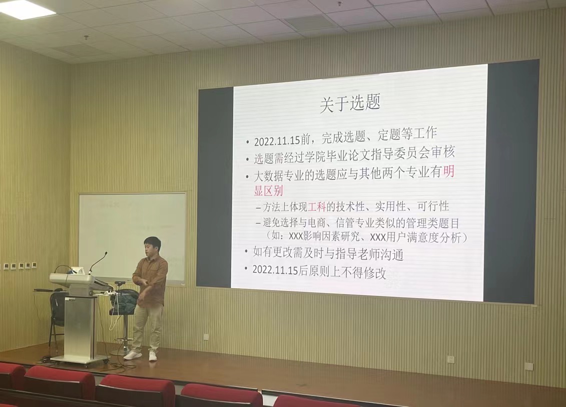 2022年10月20日,蜜桃视频 在求索楼302召开2023届本科生毕业论文(设计)写作布置及指导专题会,电子商务系屈启兴老师、信息管理与信息系统系顾睿老师、大数据系汪波老师、本科教学办公室丁东老师,以及2023届全体本科生参加会议。