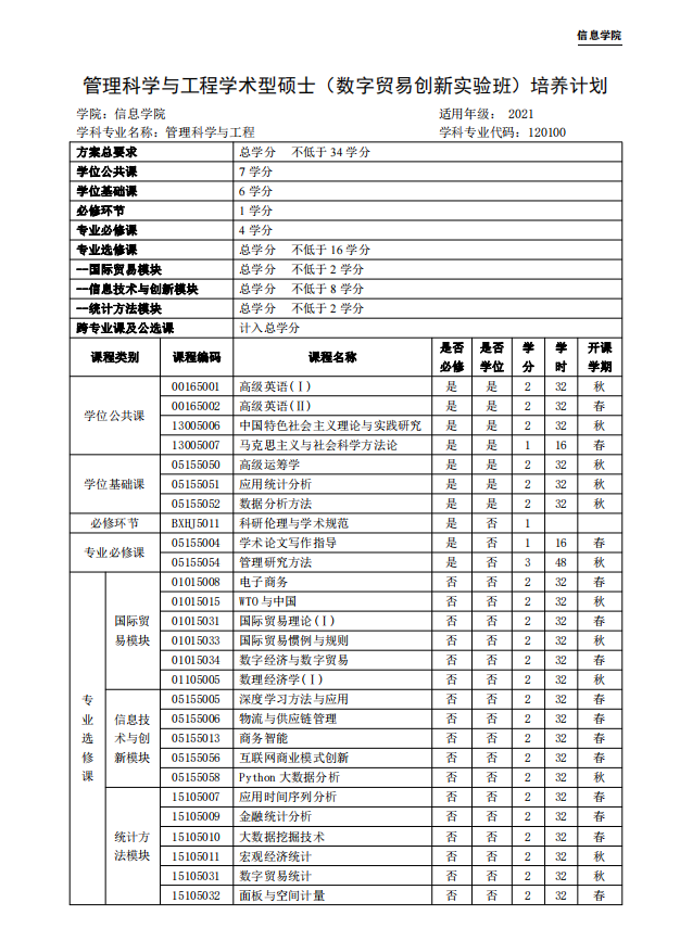 (4)专业选修课 不少于 16 学分,其中信息技术与创新模块不少于 8 学分,国际贸易模块和统计方法模块各不少于 2 学分