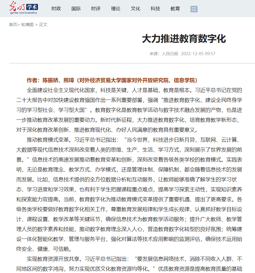 论文成果(人民日报):陈振娇、熊璋,大力推进教育数字化,人民日报,2022-12-05.